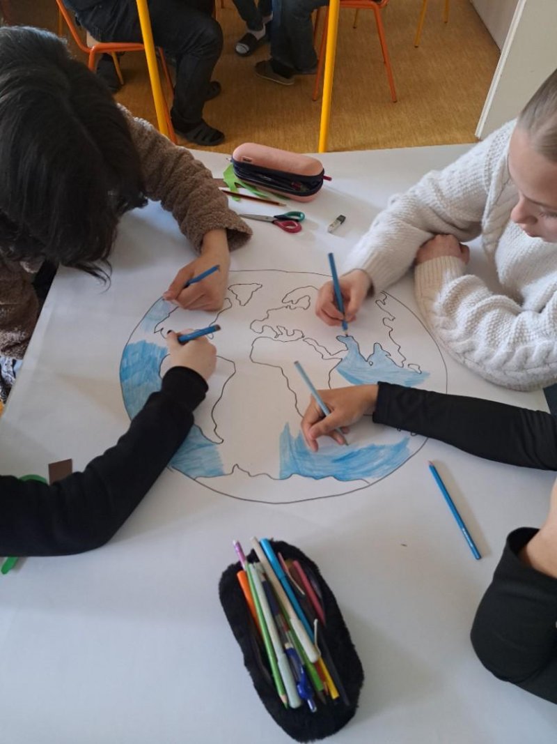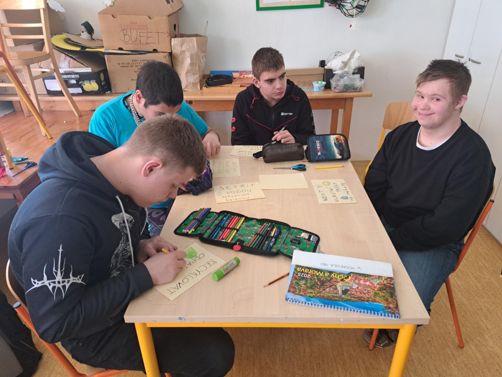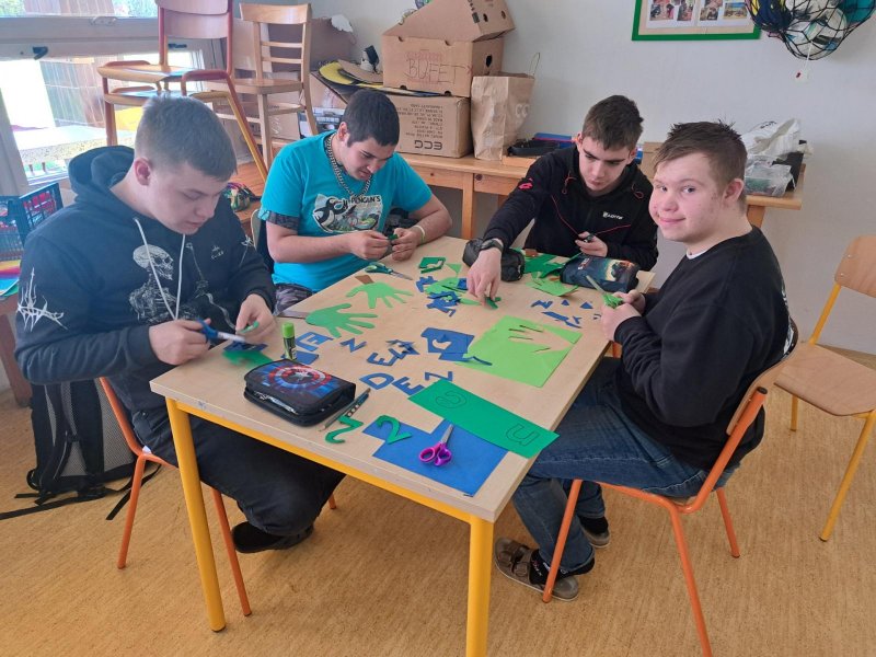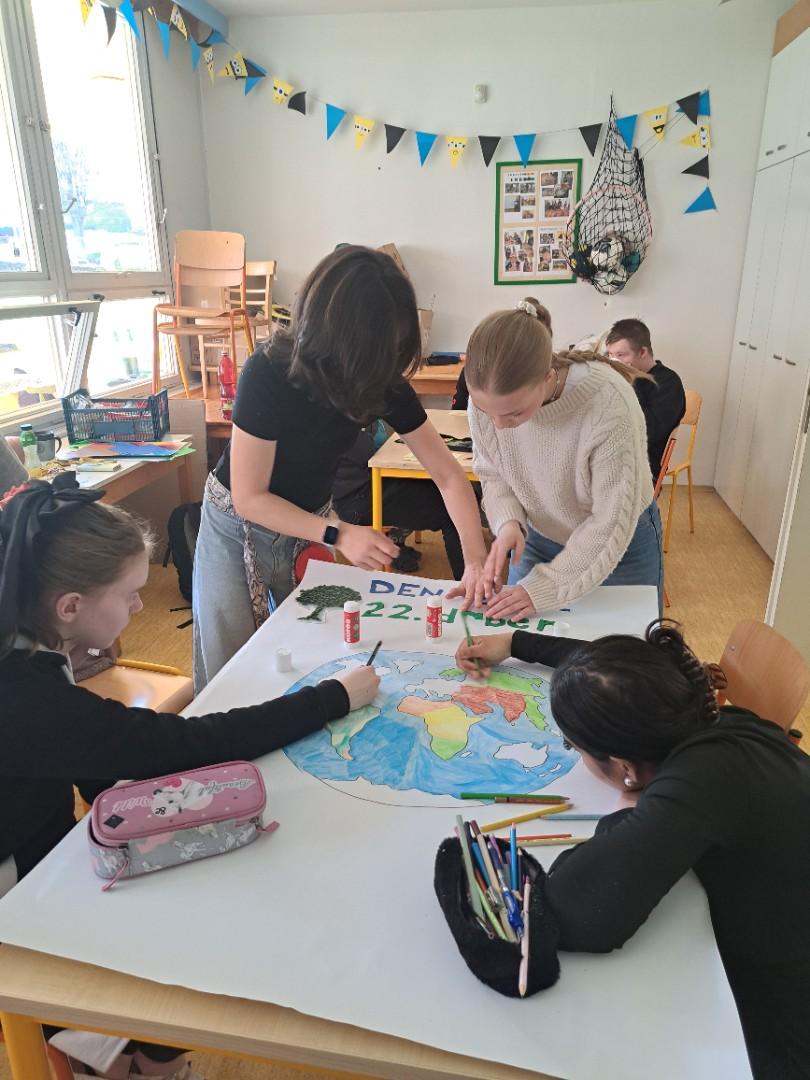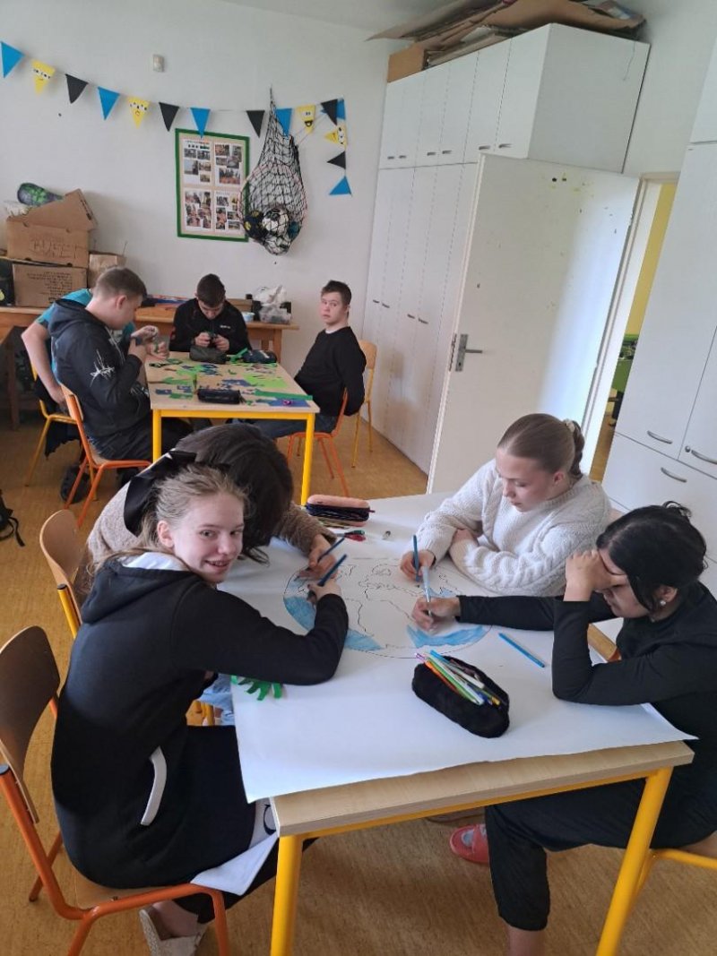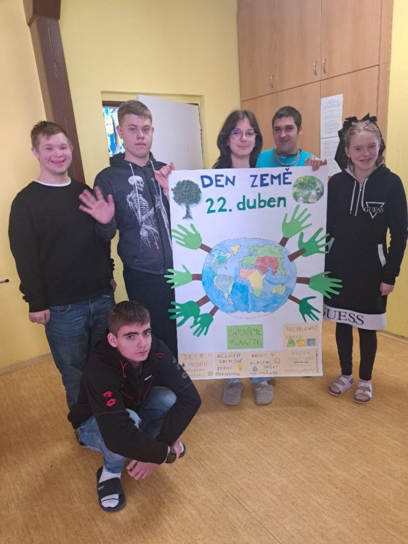 V rámci pracovních činností jsme se s žáky pustili do výroby plakátu jako připomínky oslavy Dne Země, který v letošním roce připadá na středu 22. 4. 2026. Cílem tohoto dne je podpořit ochranu životního prostředí, takže jsme si s žáky povídali o ekologické hrozbách, recyklaci odpadu a zodpovědném chování k životnímu prostředí. Plakát jsme následně vyvěsili v průchodu do jídelny, aby si mohli tento den a myšlenku připomenout všichni žáci a pracovníci školy.